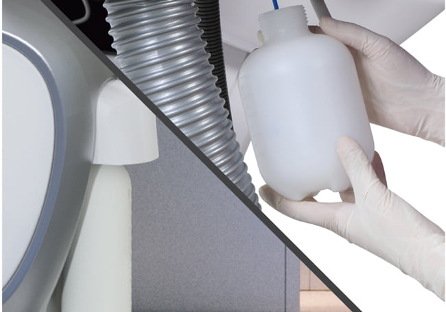 - Dwie butelki pozwalają na korzystanie z wody destylowanej oraz na dezynfekcję linii wodnych w obrębie całego unitu